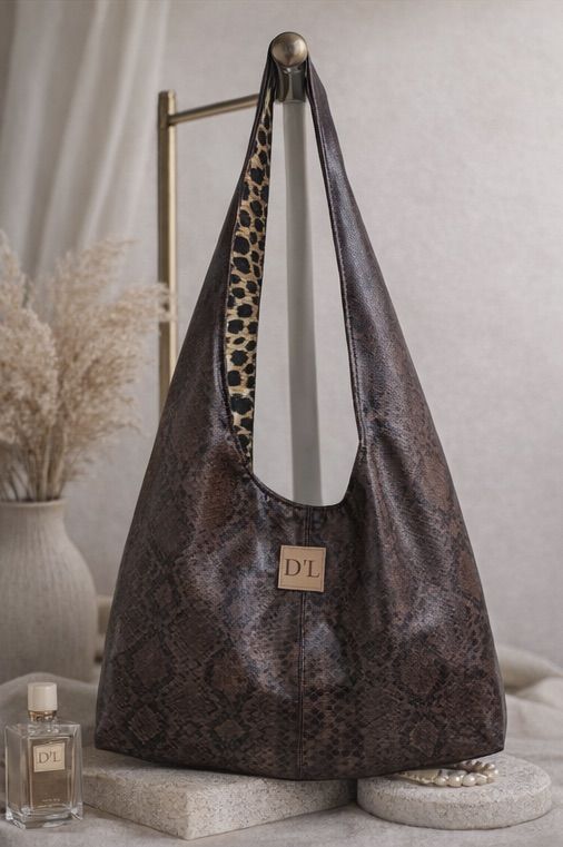 Sac cabas hobo – simili-cuir imprimé reptile de couleur marron et noir et doublure léopard