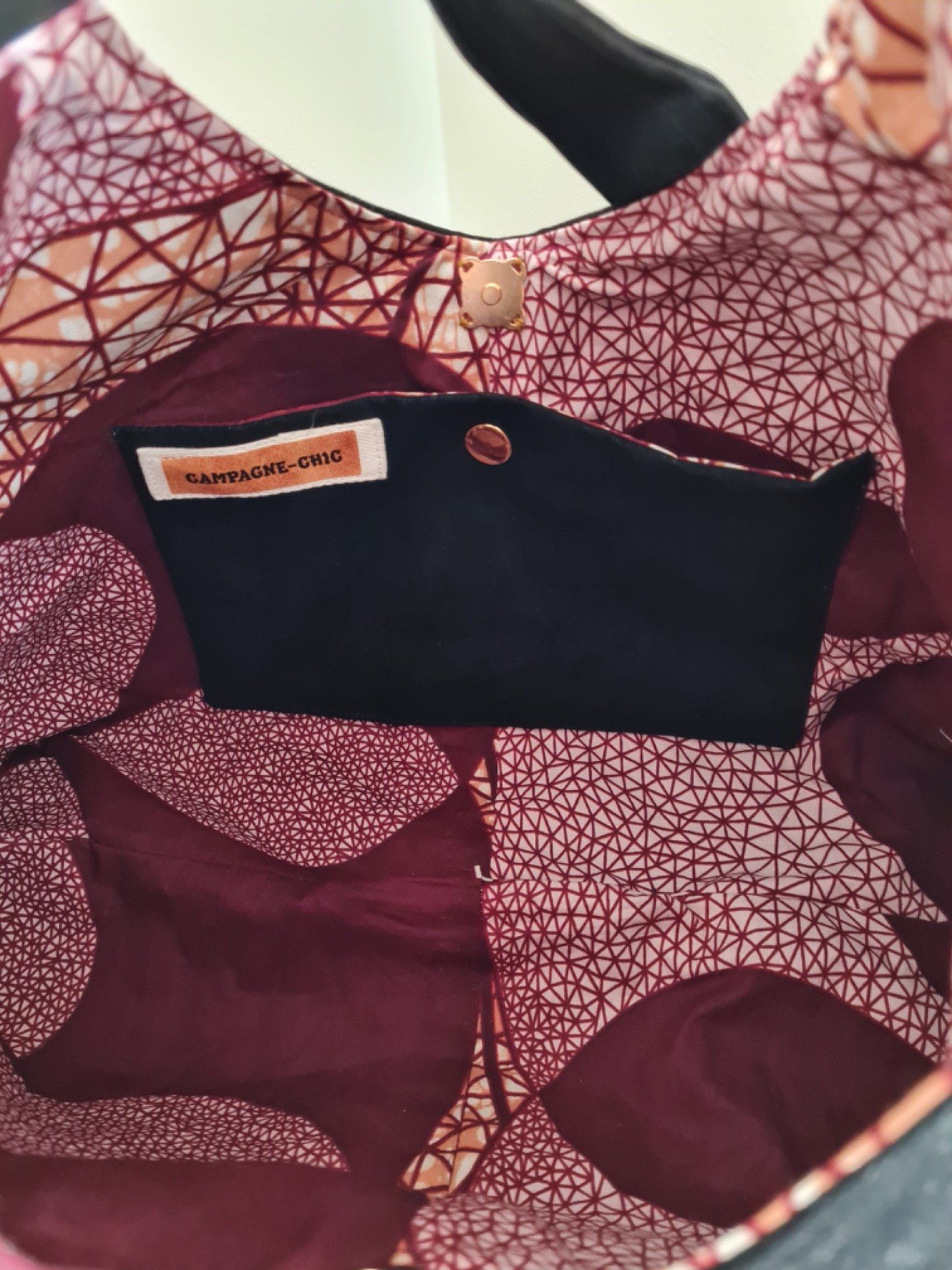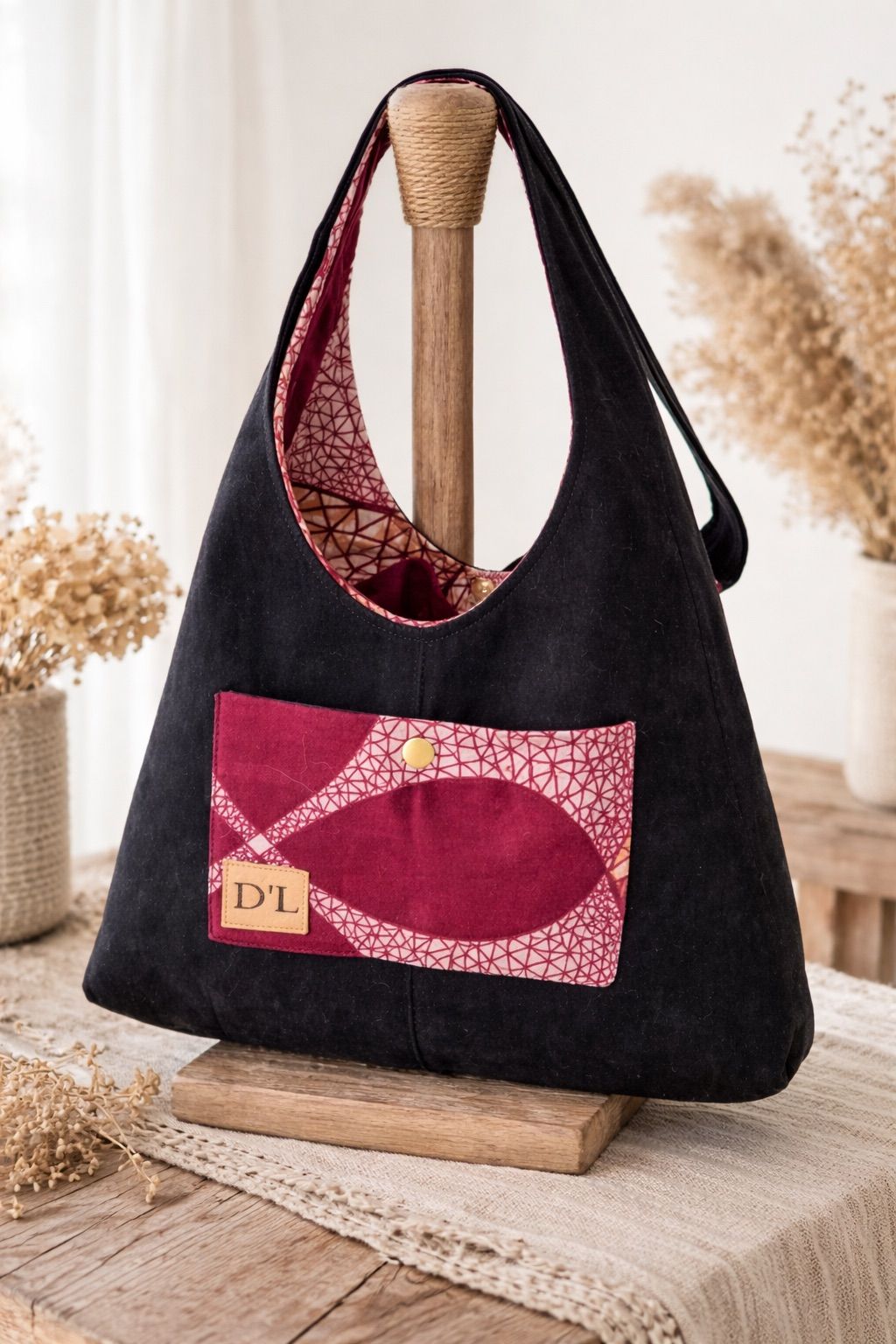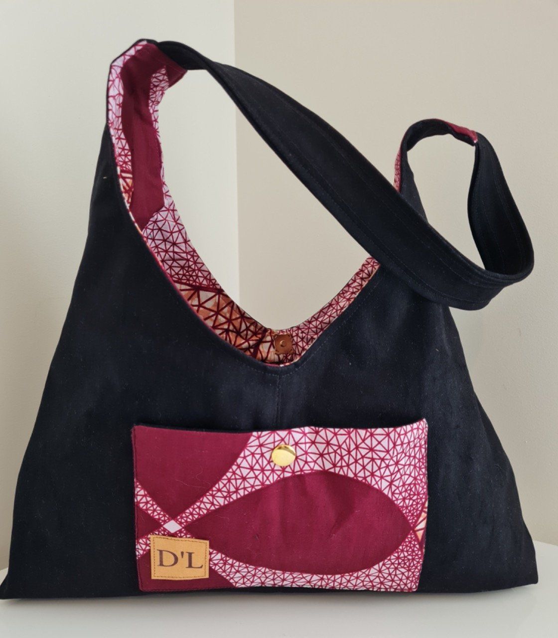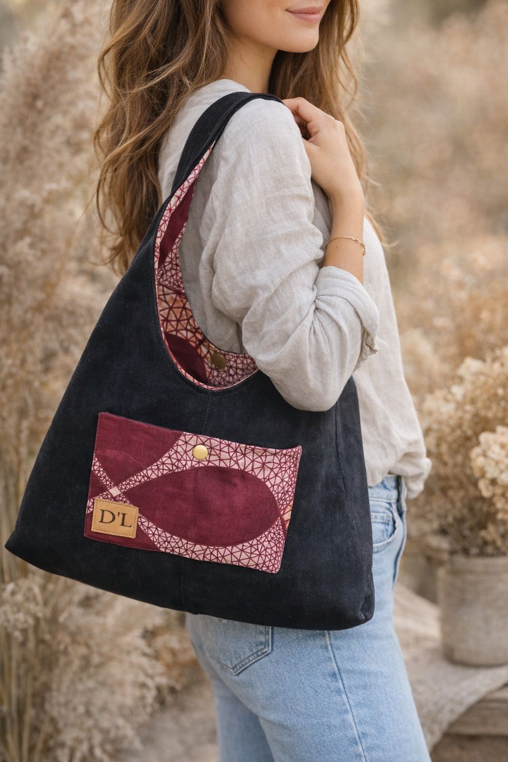 SAC PORTÉ A L'ÉPAULE EN JEAN VELOURS NOIR ET INTERIEUR WAX